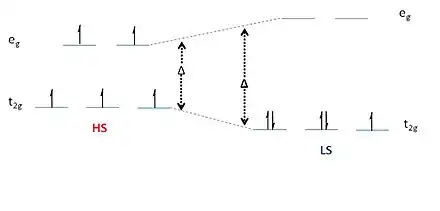 Le croisement de spin, ou spin crossover (SCO) en anglais, est un phénomène survenant dans certains complexes métalliques marqué par la transition entre deux états de spin métastables sous l'effet d'un stimulus extérieur, l'un des états ayant généralement une multiplicité plus faible (état bas spin, avec peu d'électrons célibataires) et l'autre une multiplicité plus élevée (état haut spin, avec des électrons célibataires nombreux)[1]. La pression et la température font partie des stimulus susceptibles de déclencher un croisement de spin[2], de sorte qu'on parle également de transition de spin ou d’équilibre de spin.