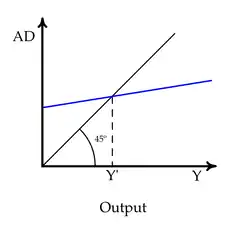 La croix keynésienne est un modèle keynésien, qui analyse l'économie à court terme, alors l'indice des prix est considéré comme une constante. Lorsque la masse monétaire augmente, les entreprises ne font pas d'ajustement par les prix, mais par les quantités, jusqu'au moment où l'économie atteint le point de plein emploi des facteurs de production. Avec la condition, parce qu'il y a l'excès de la demande sur l'offre à droite du point où les deux lignes se croisent et il y a l'excès de l'offre sur de la demande à gauche au point, l'économie qui est exprimée par la figure se déplace toujours vers le point[2].