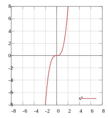 La fonction cube désigne celle qui, à un nombre réel donné associe son cube. Cette fonction est impaire, c'est-à-dire que les images d'une valeur et de son opposé sont encore opposées. Les cubes de 4 et de -4 sont respectivement égaux à 64 et -64. Le cube d'un nombre réel positif (resp. négatif) est un nombre positif (resp. négatif) et, comme les nombres entiers ou rationnels sont aussi des nombres réels, cette propriété est encore vérifiée.