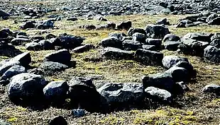 Dans la même région, le site de l'île Walrus (anciennement Hvalros O, ou Hvalrosø[199],[193]), localisé à 2 km de l'île Sabine en direction de l'est[Note 35], a révélé deux vestiges d'habitations saqqaquiennes en pierre. Ces habitats préhistoriques, établies sur la partie nord-ouest de l'île Walrus, présentent chacune un espace dégagée et un plan au sol de forme ovale. La présence d'éclats fabriqués en basalte à grain fin et issus de la réalisation de bifaces débités retrouvés à l'intérieur des vestiges, a permis d'attester que ces deux habitats ont été occupés par des saqqaquiens[201].