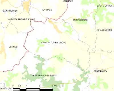En 2016, année précédant la création de la commune nouvelle de Saint Privat en Périgord, Saint-Antoine-Cumond était limitrophe de six communes dont la moitié dans le département de la Charente. À l'est, son territoire est distant d'environ 250 mètres de celui de Chassaignes.