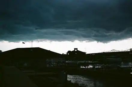 Le système orageux se décompose en deux parties dans l'image ci-contre : à gauche se trouve la zone sans précipitations visibles où la masse d'air est en ascendance généralisée et à droite la zone de précipitations où la masse d'air est entraînée dans un mouvement descendant. Entre les deux zones se trouve un nuage-mur qui est à l'origine de tornades. En outre, même les cumulus congestus associés à un orage supercellulaire peuvent être très dangereux. Des tornades peuvent être produites jusqu'à 36 km du noyau principal[39].