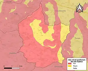 Le retrait-gonflement des sols argileux est susceptible d'engendrer des dommages importants aux bâtiments en cas d’alternance de périodes de sécheresse et de pluie[18]. La totalité de la commune est en aléa moyen ou fort (91,8 % au niveau départemental et 48,5 % au niveau national)[Carte 2]. Depuis le , en application de la loi ELAN, différentes contraintes s'imposent aux vendeurs, maîtres d'ouvrages ou constructeurs de biens situés dans une zone classée en aléa moyen ou fort[Note 3],[19].