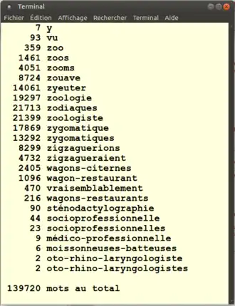 Le très simple programme suivant[4] compte en les répartissant par longueur les mots du dictionnaire français /usr/share/dict/french de GNU/Linux.
