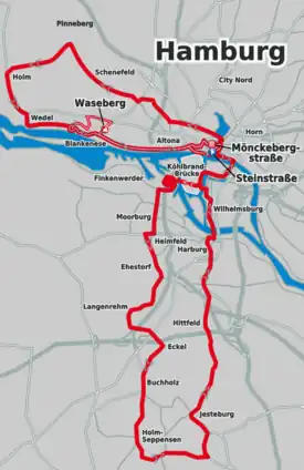 De 2005 à 2014, la première moitié du parcours consistait en une boucle au sud dans la direction de la lande de Lunebourg en Basse-Saxe, avant de retourner au centre de Hambourg et de se diriger vers une boucle à l'ouest[19].