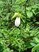 Parfois, le cypripède acaule présente une inflorescence albinos, entièrement blanche (White lady’s slipper).