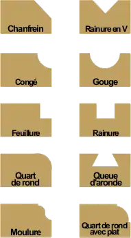 Il existe des fraises avec toutes sortes de profils, y compris des profils combinables. Pour effectuer la découpe de pièces (détourage) on utilise des fraises droites, de préférence hélicoïdales afin d'évacuer les copeaux. On trouve aussi des fraises d'affleurage destinées à l'usinage de la surface dure d'un panneau (stratifié).