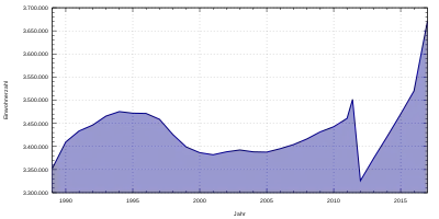 Après la chute du mur de Berlin le , le solde naturel global de Berlin était très négatif, alors que la ville a continué à accueillir plus de personnes qu'elle n'en a perdu jusque fin 1995. La population a décru pendant toute la fin des années 1990, avant de stagner au début des années 2000. Le nombre d'enfants par femme était de 1,10 en 1991, 1,06 en 1995, 1,18 en 2000 et de 1,19 en 2005[41]. L'espérance de vie à la naissance était quant à elle de 78,17 ans pour les femmes et de 71,57 ans pour les hommes en 1993. Huit ans plus tard, en 2001, elle avait progressé un peu moins vite pour les femmes (81,06 ans ; + 2,89) que pour les hommes (75,23 ans ; + 3,66). En 2009, une femme peut espérer vivre 82,35 ans et un homme 77,38[42]. L'accroissement démographique de la capitale allemande a recommencé en 2005 et s'est confirmé depuis. Il n'y eut cependant pendant cette vingtaine d'années que des estimations et aucun vrai recensement.