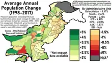 En 2023, le Pendjab demeure la province la plus peuplée avec 127,68 millions d'habitants. Le Baloutchistan, la province la plus instable du pays, montre le taux de croissance le plus élevé, soit 3,2 % (contre une moyenne nationale de 2,55%).