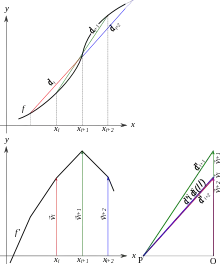On peut également effectuer une dérivation graphique, sans utiliser de calcul. On approche les tangentes par les cordes comme pour la méthode numérique. Puis, on tire des parallèles à ces droites passant par un point nommé pôle P. On considère l'intersection de ces droites avec la verticale passant par O, le segment [OP] étant horizontal. La hauteur des segments ainsi délimités est proportionnelle à la pente :