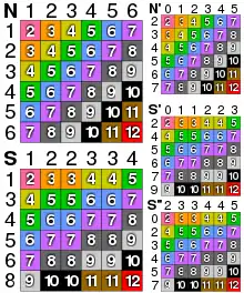 | Total des dés | 2 | 3 | 4 | 5 | 6 | 7 | 8 | 9 | 10 | 11 | 12 |