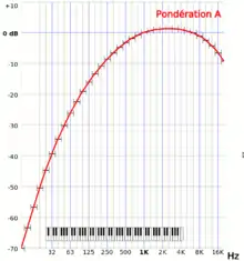 La pondération A donne peu d'importance aux basses, ce qui correspond à la sensibilité de l'oreille pour les sons purs à faible volume sonore[10]. La courbe isosonique prise en compte pour l'établissement de la pondération est celle correspondant à 40 dB au-dessus du seuil de perception[11]. C'est le niveau sonore d'un environnement très calme.