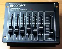 La commande se fait généralement à l'aide de pupitre, ou console DMX. Cet appareil peut être plus ou moins complexe, et gérer à lui tout seul un spectacle complet, et plusieurs lignes DMX (par exemple 1024, 1536, 2048... (n fois 512) canaux)[3]. On parle alors d'univers DMX, un univers possédant 512 canaux.