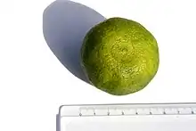 Le fruit (6 cm de diamètre) est spécialement juteux (50 %)[4]. Il est récolte vert de fin aout à fin octobre. Il a des pépins qui sont très peu polyembryonniques, le nombre d'embryons par graine est de 1,4 seulement[5].
