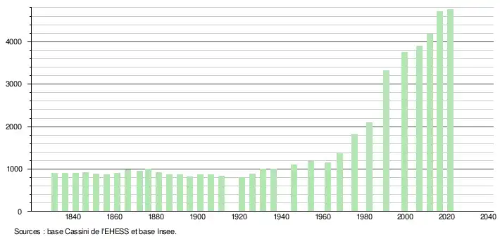 L'évolution du nombre d'habitants est connue à travers les recensements de la population effectués dans la commune depuis 1831. Pour les communes de moins de 10 000 habitants, une enquête de recensement portant sur toute la population est réalisée tous les cinq ans, les populations légales des années intermédiaires étant quant à elles estimées par interpolation ou extrapolation[23]. Pour la commune, le premier recensement exhaustif entrant dans le cadre du nouveau dispositif a été réalisé en 2006[24].