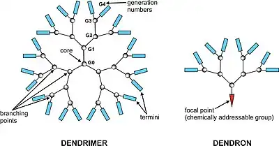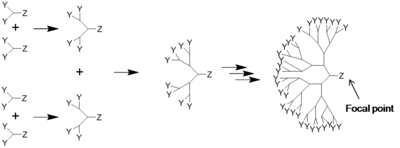 Dans la synthèse des dendrimères, les monomères mènent à un polymère monodispersé, tel un arbre[4]. Il y a deux méthodes définies de synthèse des dendrimères : synthèse divergente[5],[6] et synthèse convergente[7]. La première assemble la molécule du noyau jusqu'à la périphérie et le second de l'extérieur vers le noyau.