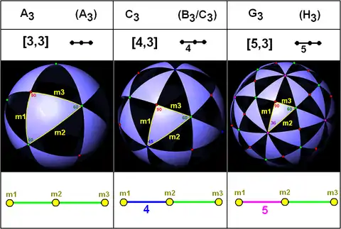 - Trois miroirs peuvent engendrer les polyèdres uniformes, incluant les nombres rationnels est l'ensemble des triangles de Schwarz (en).