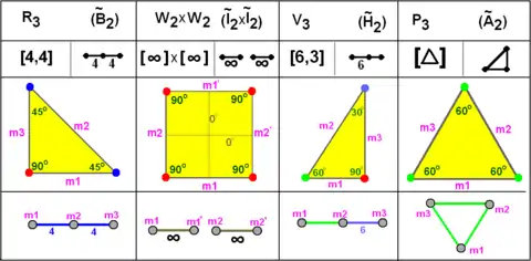 - Trois miroirs dans un triangle forment des images vues dans un kaléidoscope traditionnel et sont représentées par 3 nœuds attachés dans un triangle. En répétant les exemples auront des arêtes étiquetées comme (3 3 3), (2 4 4), (2 3 6), bien que les deux derniers peuvent être dessinés dans une droite avec l'arête 2 ignorée. Ceux-ci engendreront les pavages uniformes.