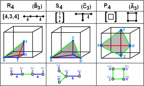 - Bn est la famille des demi-hypercubes, commençant à n=4 avec le 24-cellules et n = 5 avec le penteract (aussi nommé Dn).