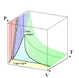 Dans le cas des changements d'état (gaz-liquide-solide) d'un corps pur, les résultats sont parfois présentés sous la forme d'un diagramme en trois dimensions, les axes étant la pression P, le volume V occupé par le système et la température T.