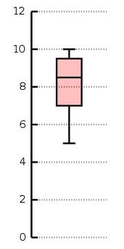 Cette boîte à moustaches a été réalisée avec des moustaches d’une longueur pouvant atteindre 1,5 fois l’intervalle interquartile, soit un maximum de 3,75 unités de long. Cependant, les moustaches n'atteignent toujours qu'une valeur des données qui se trouvent toujours dans ces 3,75 unités. Ainsi, la moustache supérieure va jusqu’à 10, car il n’y a pas de valeur plus grande dans les données, et la moustache inférieure, jusqu’à 5, car la valeur immédiatement inférieure est à plus de 3,75 du début de la boîte.