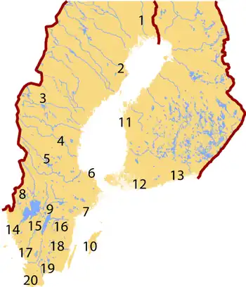 - Le götalandais, les dialectes du Götaland (Götamål) (y sont compris aussi les dialectes du Värmland, mais non pas les dialectes des anciennes provinces danoises: la Scanie, le Blekinge et le Halland, ni les dialectes de l'île de Gotland) ;