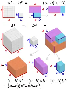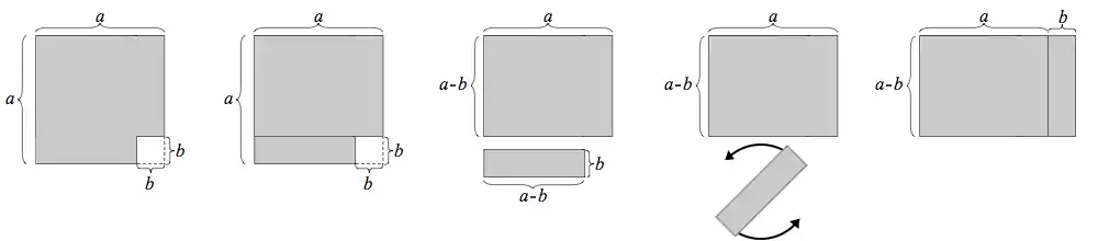 Une autre preuve géométrique procède comme suit : on commence avec la figure montrée dans le premier schéma ci-dessous, un grand carré dont un plus petit carré a été retiré. Le côté du carré entier est a, et le côté du petit carré retiré est b. L'aire de la région ombrée est . Une coupe est effectuée, divisant la région en deux morceaux rectangulaires, comme présenté sur le deuxième schéma. La plus grande pièce, en haut, a une largeur a et une hauteur a-b. La plus petite pièce, en bas, a une largeur a-b et une hauteur b. Maintenant, la plus petite pièce peut être détachée, tournée et placée à droite de la plus grande pièce. Dans cette nouvelle disposition, illustrée dans le dernier schéma ci-dessous, les deux pièces forment ensemble un rectangle, dont la largeur est et dont la hauteur est . L'aire de ce rectangle est . Étant donné que ce rectangle provient de la réorganisation de la figure d'origine, il doit avoir la même aire que la figure d'origine. Donc, .