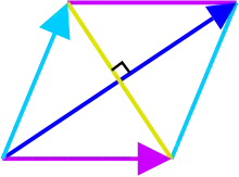 La preuve est identique. Pour le cas particulier où a et b ont des normes égales (ce qui signifie leurs produits scalaires sont égaux, car ), cela démontre analytiquement le fait que deux diagonales d'un losange sont perpendiculaires. Cela découle du fait que le membre de gauche de l'équation est égal à zéro, nécessitant que le membre de droite soit également égal à zéro, et donc le produit scalaire de la somme vectorielle de a + b (la longue diagonale du losange) avec la différence vectorielle a - b ( la petite diagonale du losange) doit être égal à zéro, ce qui indique que les diagonales sont perpendiculaires.