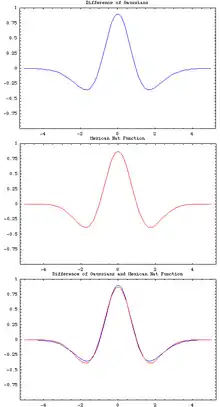 La différence de gaussiennes est une ondelette mère de somme totale nulle qui approche l'ondelette chapeau mexicain en soustrayant une gaussienne large d'une gaussienne étroite, comme défini dans cette formule dans le cas d'une dimension :