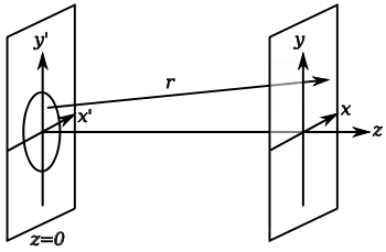 Cette formule peut être trouvée à partir de l'intégrale de diffraction de Kirchhoff, où l'expression de la distance est approchée à l'aide d'un développement limité (dimensions transverses petites devant z).