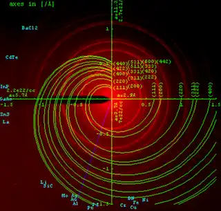 Dans cette équation, G est le vecteur du réseau réciproque, q est égal à la longueur du vecteur du réseau réciproque, k est le vecteur de transfert de densité, θ est la moitié de l'angle de diffraction et λ est la longueur d' onde de la radiation. Les données de diffraction de poudre sont généralement présentées sous la forme d'un diagramme de diffraction dont l'intensité diffractée, I, est représentée comme une fonction de l'angle de diffraction 2θ, ou comme une fonction de la diffraction du vecteur de longueur q. Cette dernière variable à l'avantage que le diagramme de diffraction ne dépend plus de la valeur de la longueur d'onde λ. L'arrivée du synchrotron a considérablement élargi le choix de la longueur d'onde. Afin de faciliter la comparabilité des données obtenues avec différentes longueurs d'onde, l'utilisation q est donc recommandé.