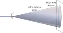 Lorsqu'un rayonnement diffusé est détecté sur un écran, l'étalement de rotation amène à lisser les anneaux de diffraction autour de l'axe du faisceau, plutôt que les discrètes taches de Laue observées dans la diffraction cristalline unique. L'angle entre l'axe du faisceau et l'anneau est appelé l'angle de diffusion et en cristallographie aux rayons X, celui-ci est toujours noté 2θ (dans la diffusion de la lumière visible, la convention est généralement l'appeler θ). Conformément à la loi de Bragg, chaque anneau correspond à un vecteur G particulier du réseau réciproque dans le morceau de cristal. Cela conduit à la définition du vecteur de diffusion en tant que :