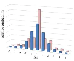 ![]() Figure 7. Graphe montrant la distribution de probabilité relative de déplacement d'un adatome, Δx, lors d'une diffusion a une dimension. Bleu: simple saut ; Rose: double saut, avec un rapport : simple saut/double saut = 1. | |