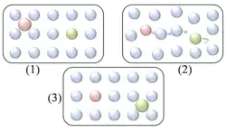 ![]() Figure 9. Mécanisme d'échange atomique à grande portée pour une diffusion sur un réseau carré. L'adatome rose qui est à la surface (1) provoque des perturbations dans les atomes environnant du réseau (2), ce qui a pour conséquence de faire sortir un atome du substrat (vert) (3)[1] |