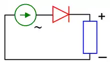 - Elles peuvent être utilisées en courant alternatif pour diminuer la puissance fournie par l'alimentation à un récepteur : en supprimant l'une des alternances, elles permettent de diviser par deux la puissance transmise à la charge[22] pour un coût très modique. Cette technique est par exemple utilisée pour obtenir deux puissances de chauffe dans les sèche-cheveux, une diode, placée en série avec la résistance de chauffage, est mise en court-circuit par un interrupteur pour obtenir la puissance de chauffe maximale[n 5].