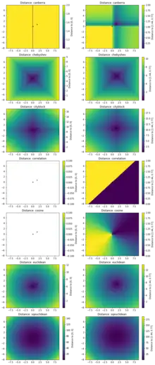 En particulier, dans ℝn (donc aussi dans ses sous-ensembles[6]), on peut définir de plusieurs manières la distance entre deux points, bien qu'elle soit généralement donnée par la distance euclidienne (ou 2-distance). Soit deux points de E, (x1, x2, …,xn) et (y1, y2, …,yn), on exprime les différentes distances ainsi :