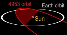 L'orbite de (4953) 1990 MU, qui, avec une distance minimale d'intersection de l'orbite terrestre de 0.0276 AU, est classé comme un objet potentiellement dangereux