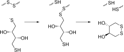Le DTT est un agent réducteur fort, dont l'efficacité résulte de sa propension à former un cycle à six atomes avec un pont disulfure interne. Son potentiel redox est de -0,33 V à pH 7. La réduction d'un pont disulfure procède par un mécanisme séquentiel en deux étapes, comme illustré ci-dessous. L'intermédiaire avec un pont disulfure mixte est peu stable, car le second thiol du DTT a une forte tendance à refermer le cycle, donnant ainsi le DTT oxydé et deux thiols libres à la place du pont disulfure initial.