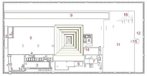 L'ensemble funéraire est le premier projet architectural construit entièrement en pierre. Ce complexe avait quatorze entrées, dont une seule était fonctionnelle. Il se compose, entre autres, de la grande cour sud (5) et de la cour nord (11) avec au centre la pyramide à degrés de Djéser (1), entourée d'un mur d'enceinte en pierre de 10,5 mètres de haut. À côté des cours principales, une entrée à colonnade couverte (10) mène à la cour sud et à une chambre Serdab (14) qui abrite la statue assise du roi Djéser.