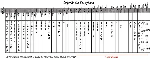 Voici un tableau non exhaustif des doigtés du grave et de l'aigu. Les grosses notes sont les notes lues, et les petites les notes réelles entendues pour un saxophone alto (instrument transpositeur, en Mi♭). Un saxophone alto, en Mi♭, sonne une sixte majeure plus bas que ce qu'il lit : lorsque le saxophoniste alto lit et joue un do sur une partition, la note réelle entendue est un Mi♭ situé une sixte majeure plus bas.