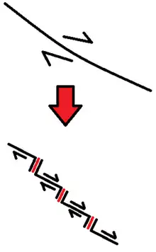 Si la dorsale doit relier deux points géographiques en alternant crête et faille transformante, le trajet minimisant l'énergie nécessaire au déplacement dépend du rapport entre l'énergie dépensée par le coulissement d'une faille transformante et celle dépensée par l'extension d'une crête[11]. Cette détermination du « moindre parcours » correspond classiquement au principe de Fermat gouvernant la réfraction, et la solution correspond ici au calcul de l'angle limite, qui tend à être un angle droit lorsque le « coût » d'une crête est très significativement plus élevé que celui de la faille : s'il y a un facteur cent entre les deux coûts linéaires, l'angle de rentrée sera .