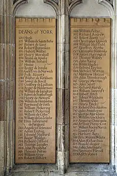 ![]() Plaque à York Minster énumérant les doyens de York ![]() York Minster |
