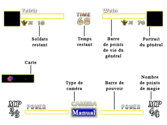 Le joueur est amené à diriger un groupe constitué d'un général et au maximum de cent soldats. Chaque commandant représente une classe particulière : chevalier, moine, magicien, prêtre, ninja, samouraï, etc. Il existe dix types de métiers principaux, chacun apportant des tactiques, compétences ou sorts de magie divers[11]. La victoire dans une bataille rapportent des points d'expérience dont l'accumulation est nécessaire aux personnages pour gravir des niveaux, qui eux-mêmes engendrent une augmentation des caractéristiques – vie, magie, force et commandement – et de nouvelles compétences. Un général utilise les services d'un type de troupes spécifiques : soldats, cavalerie, archers, harpies, zombis, dragons, etc. Au commencement, un commandant accède à une, voire plus, catégorie de combattants. D'autres se débloquent au moyen d'objets découverts dans les châteaux. Selon sa catégorie, une armée est plus ou moins efficace contre un autre type de troupes[6],[4]. Ce paramètre a une influence prépondérante sur l'issue du conflit. Par exemple, un nombre restreint de soldats particulièrement efficace peut détruire un groupe de combattants plus nombreux mais moins puissants[10].