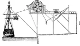 L'installation comporte une voie ferrée sur laquelle arrivent des wagonnets, surélevée de quelques mètres par rapport au quai. Cette voie se termine par un plateau mobile, suspendu à un cadre oscillant autour d'un axe horizontal situé au niveau du quai. Quand le plateau est en position haute, le cadre est presque vertical, et quand il s'incline, le plateau est déporté latéralement jusqu'à venir au-dessus du navire à charger, et en même temps un contrepoids pendant à l'extrémité d'une vergue est entrainé latéralement. Ce contrepoids est insuffisant pour empêcher la descente d'un wagonnet chargé, et un opérateur la contrôle avec un frein. Une fois arrivé en bonne position, le wagonnet est vidé, et c'est alors le contrepoids qui l'entraine et le ramène en position haute, reconstituant la continuité de la voir ferrée.