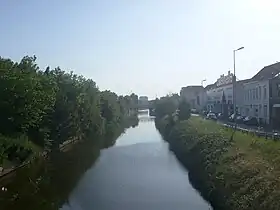 Le canal de Bergues est le canal de plus ancien du Dunkerquois, il a été creusé au XVIe siècle et mis en service en 1634[8], afin de relier la ville de Bergues à l'arrière-port de Dunkerque. Son lit suit un axe globalement sud-nord. Il reçoit les eaux du canal de la Haute-Colme. À son arrivée à Dunkerque, le canal se divise en deux embranchements. La partie ouest du canal de Bergues séparant le « Jeu de Mail » sur sa rive gauche de la Basse-ville sur sa rive droite aboutit dans la partie ouest du « canal de jonction ». La partie est[Note 2] sépare la Basse-ville de Coudekerque-Branche sur sa rive droite et aboutit à l'extrémité est du « canal de jonction » au niveau de la zone des « 4 écluses », qui est un « carrefour hydraulique » de Dunkerque.