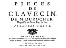 Pièces de Clavecin de M. (Monsieur?) Durocher, « Organiste de Saint-Jean-de-Luz » selon ce que nous apprend la couverture du recueil, il publie en 1733 chez J.-B. Christophe Ballard, à Paris, une Première Suite de pièces en ut.