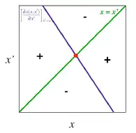 Comme on l’a expliqué, les régions positives représentent la combinaison de trait (x ; x’) pour laquelle le mutant avec le trait x’ peut envahir la population résidente qui possède le trait x ; À l’inverse, les régions négative représente la combinaison de trait pour laquelle un mutant avec le trait x’ ne peut pas envahir le milieu et ainsi disparaît. On peut ainsi déterminer le caractère invasible ou non de la stratégie singulière en regardant dans quelques zones se situent les valeurs de x’. Pour la Figure 4. par exemple à x*, quelles que soient les valeurs de x’ on se trouve dans une région négative, l’équilibre et donc stable et le mutant ne peut pas envahir la population.