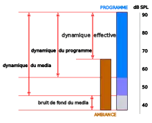 La dynamique effective d'un programme au moment où il est écouté n'est plus celle du moyen de transmission. Au bruit de fond de celui-ci s'ajoute celui du lieu d'écoute. Si la dynamique du programme est trop grande, ses parties les plus faibles seront perdues dans le bruit de fond du local d'écoute.