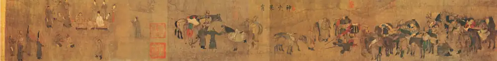 Après avoir sécurisé leur frontière avec le Goryeo, les Khitans attaquent la dynastie Song en 994 et assiègent Zitong, mais ils sont repoussés par les défenseurs de la cité, qui utilisent des flèches de feu (en)[110]. Les Khitans lancent une série de campagnes contre les Song en 999. Bien que généralement victorieux sur le champ de bataille, ils ne parviennent pas à obtenir quoi que ce soit de réellement important de la part des Song. Cela change en 1004 lorsque Shengzong et sa mère mènent une campagne éclair jusqu'aux abords de Kaifeng, la capitale des Song, en ne prenant que les villes qui se rendent, tout en évitant de se lancer dans des sièges prolongés lorsqu'ils se retrouvent face à des villes qui résistent fortement. L'empereur Song Zhenzong sort alors de sa capitale et rencontre les Khitan à Chanyuan, une petite ville sur le fleuve Jaune. En janvier 1005, les dirigeants des deux empires signent le traité de Chanyuan, qui stipule que les Song doivent donner chaque année 200 000 rouleaux de soie et 100 000 onces d'argent aux Liao, que les deux empereurs doivent s'adresser l'un à l'autre en parlant d'égal à égal, qu'ils finalisent le tracé de leur frontière contestée et que les deux dynasties doivent reprendre des relations cordiales. Aucune guerre n'éclate entre les Song et les Khitans durant le siècle qui suit la signature du traité, bien que les sommes versées, appelées "cadeaux" par les Song et "tributs" par les Liao, soient ensuite réévaluées à 300 000 rouleaux de soie et 200 000 onces d'argent par an, les Song craignant que les Liao ne forment une alliance militaire avec les Xia occidentaux[111]. En signant le traité, les Song renoncent à leurs prétentions sur les seize préfectures[53]. Une partie de la frontière délimitée par le traité passe dans la plaine de la Chine du Nord, dans le Hebei, soit une zone totalement dépourvue de défenses. Pour fortifier ces zones frontalières très périlleuses, les Song créent une vaste forêt défensive le long de la frontière Song-Liao, afin de contrecarrer les éventuelles attaques de la cavalerie khitane[112].