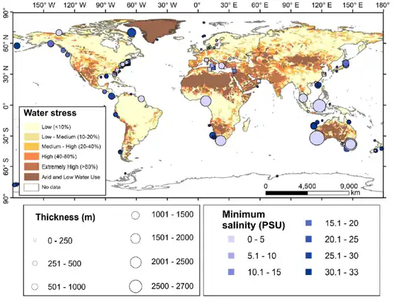 Les systèmes d'OFG font l’objet d’une attention croissante car ils peuvent être servir de sources non conventionnelles d’eau potable dans les zones côtières, où les ressources en eaux souterraines sont rapidement épuisées ou contaminées[2]. Les zones de stress hydrique[25] — défini comme le rapport entre les prélèvements totaux d'eau et les réserves d'eau de surface et souterraines renouvelables disponibles — accueillent 60 % de la population mondiale (voir supra). Le changement climatique, la croissance démographique rapide et l’urbanisation ont un impact négatif sur la disponibilité de l'eau, en particulier dans les communautés côtières[26]. Par conséquent, l’eau souterraine douce en mer a été proposée comme source alternative pour atténuer le stress hydrique écologique et l’épuisement des eaux souterraines[25].